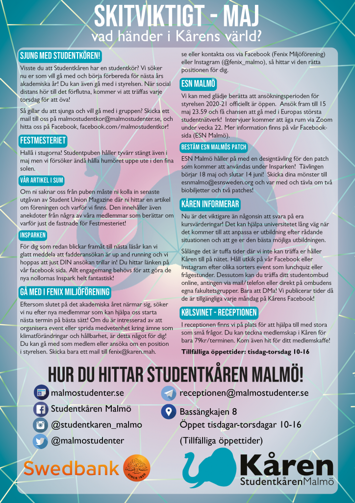 Se vad som händer i Kårens värld i Maj. Glöm inte att vi fortfarande har öppet Kölsvinet tis-tors 10-16!